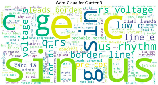 To gain deeper insight into the semantic content of the clusters, we generated word clouds for individual clusters (specifically clusters 3, 4, 5, 7, 8, and 9). These word clouds highlighted dominant terms unique to each group. For example, cluster 9 frequently included terms such as normal, rate, and sinus, suggesting that these reports often described routine or unremarkable ECG findings. Cluster 5, on the other hand, emphasized terms like atrial, fibrillation, and abnormal, indicating a concentration of pathological interpretations as shown in Figure 10 and sample word clouds in Figure 11 and Figure 12.
