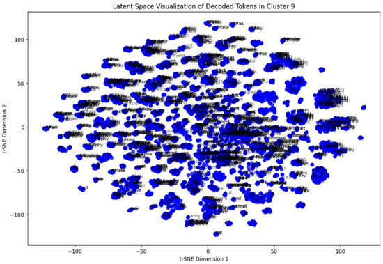 In the last step, a token-level latent space analysis was performed on Cluster 9. By extracting token embeddings and reducing them to two dimensions via t-SNE, we visualized the semantic arrangement of words within the cluster. Repeated patterns of clinically relevant terms appeared closely packed, indicating coherent language usage in these ECG interpretations (Figure 14).