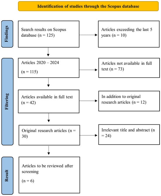 The research feasibility criteria in the SLR were designed to ensure that only studies that were relevant, high-quality, and fit for the research objectives were included in the analysis [53,54]. First, the selected article should specifically address the application of machine learning models or algorithms in malware detection. Studies that only included the theory or development of algorithms without real implementation in the context of malware detection were not included. Second, the included studies should present measurable empirical data, such as accuracy levels, precision, recall, F1-scores, or other performance metrics reported quantitatively to allow comparisons between studies [55]. Third, the article should discuss or implement at least one machine learning algorithm, such as K-Nearest Neighbors (KNN), Random Forest, or Gradient Boosting [56]. In addition, the article should use a well-described dataset, both from public sources and independent collection results, with detailed information regarding the size, type, and source of the dataset. Only articles published in English and within the last 5 years were considered, to ensure the relevance and up-to-date quality of the information. After the selection process based on these criteria, only 6 articles were found that were eligible for further analysis, as shown in Figure 1. These articles were selected because they made a significant contribution to the understanding and development of machine learning-based malware detection methods.