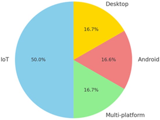 The distribution of platforms targeted for malware detection is visualized in the chart, highlighting the prevalence of IoT-focused studies at 50.0%, followed by Desktop and multi-platform studies at 16.7% each, and Android studies at 16.6%, as shown in Figure 4.