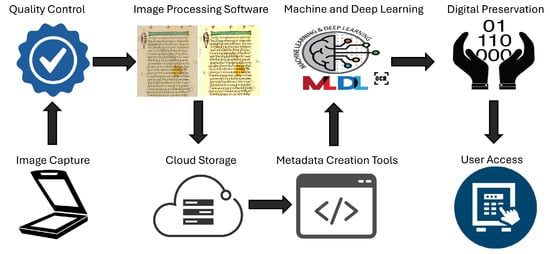 Figure 1 illustrates the digitization workflow of historical writings. At first, images of the pages and covers are captured based on the necessary standards and rules. At the same time, researchers who interact with the original manuscripts record features that will be used as metadata. Next, a control check confirms their quality; the process is re-initialized if issues arise. Subsequently, during step 3, advanced image processing techniques are employed to improve the legibility of the scanned documents. These are stored in the cloud, with ensured accessibility and security, in step 4 for further analysis. Valuable information is documented throughout metadata creation, including the manuscript’s origin, authorship, and context. Moreover, at this phase, researchers provide important details for ensuring the efficiency of the subsequent stages. In the sixth step, all generated data are examined through machine and deep learning tools, allowing OCR to convert the handwritten text into a machine-readable format. It is worth noting that this end-to-end pipeline commits to archiving cultural heritage and digitizing books and all their essential components. The process culminates in making all this data available to users.