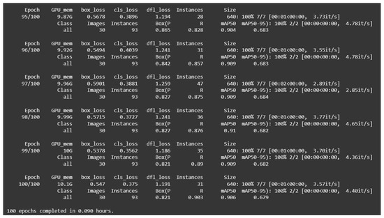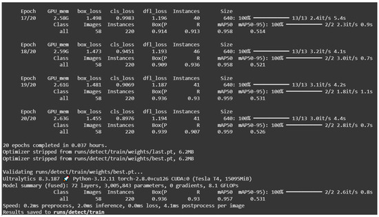 Figure 1 shows the training log of YOLOv8n, showing the progress and performance metrics over epochs. Key metrics include box_loss and cls_loss, which measure the accuracy of predicted bounding boxes and classification performance. The dfl_loss focuses on challenging classes, while mAP50 and mAP50–95 represent the model’s mean average precision at various IoU thresholds (0.5 and 0.5–0.95, respectively). The log shows GPU memory usage and the number of instances and images processed per epoch. As training progresses, the decreasing loss values and improving mAP scores suggest that the model is effectively learning the underlying patterns in the dataset. Batch sizes and processing times are provided to present the efficiency of the training process.