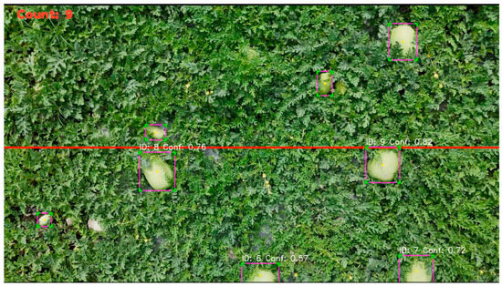 Figure 3 shows the real-time detection of watermelon in a real field. The “Count: 9” at the top indicates that there are nine watermelons that have already been detected and counted. The red line is the counting logic applied to the video frame. As the center of a bounding box touches the red line, the algorithm captures and saves key metrics (unique ID, confidence score, width, height, area, and timestamp) in Microsoft Excel for each detected watermelon. This process ensured that only the relevant data for watermelons that intersect with the designated line was logged, facilitating precise tracking and analysis of the detected watermelon.