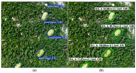 (a) Watermelon detection using YOLOv8n-OBB. (b) Watermelon detection and area measurement with modified YOLOv8-OBB.
