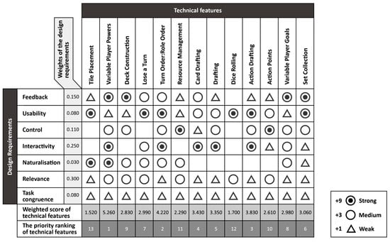 Figure 1. House of quality for educational table games. - The importance weights of the seven design requirements were calculated by the design team using AHP. The process included the following steps: (1) Converting expert responses into a pairwise comparison matrix (Table 2); (2) Calculating weights via normalization of the geometric mean of rows (results in Table 3); (3) Conducting a consistency test to verify the validity of the questionnaire. Equations (1)–(3) present the AHP calculation formulas.