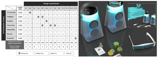 The feasibility of the design in this study was evaluated by experts. Subsequently, the design team applied the QFD method to guide the development of the IoT-integrated board game and optimize the gameplay process. The left wall of the House of Quality (Figure 2) represents the design requirements, which were synthesized from the relevant literature. These requirements include connectivity, intelligence, analytics, interactivity, adaptability, security, and scalability. The importance weights of each design requirement were determined through in-depth discussions within the design team. An IoT-enabled board game was developed to enhance instructional effectiveness, with the design outcome and gameplay approach as illustrated in Figure 2.