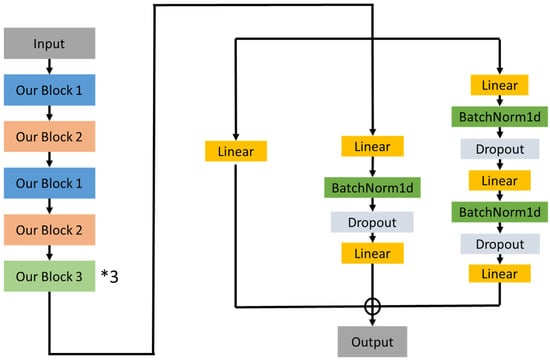 The neural network in this study adopted a modular design with repeated custom blocks and multiple branches with linear, normalization, and dropout layers (Figure 1). First, the input passes through a series of custom modules are detailed in Figure 2. The block marked with ‘×x’ is repeated x times during the computation. After the stacked blocks, the network branches into three parallel paths: path 1 (a simple linear transformation), path 2 (a more profound sequence of layers), and path 3 (an even deeper structure). Finally, the outputs from all three paths are merged to produce the final result. By combining deep modular blocks with multi-branch paths through linear, dropout, and normalization layers, the architecture of the developed model improves feature learning, reduces overfitting, and captures diverse representations.