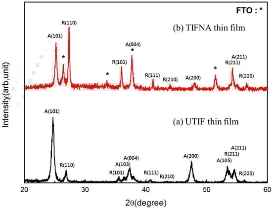 Figure 1 presents the X-ray diffraction (XRD) patterns of (a) UTIF and (b) TIFNA deposited on FTO substrates. The diffraction peaks are indexed to the anatase (A) and rutile (R) phases of TiO