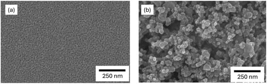 Figure 2a) exhibits a smooth and compact surface composed of densely packed fine particles with relatively low surface roughness. The uniform morphology suggests limited surface area, which may restrict dye adsorption and hinder light harvesting efficiency in DSSCs. In contrast, the film incorporating 25 nm TiO