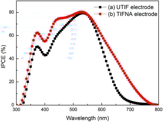Figure 4 shows the incident photon-to-electron conversion efficiency (IPCE) spectra of DSSCs based on the UTIF and TIFNA electrodes. Compared with the UTIF-based device, the TIFNA-based DSSCs exhibited a significantly enhanced IPCE response over the visible spectrum (300–750 nm). The TIFNA electrode exhibited an IPCE maximum of about 82% around 520 nm, while the UTIF electrode reached a lower peak of about 78%. In addition, TIFNA maintained a high IPCE in both the short-wavelength range (300–400 nm) and the long-wavelength region above 600 nm. This more extensive and intense response indicates that the dye molecules adsorbed on the TIFNA film have more efficient photon absorption and charge injections. The improvement in IPCE was attributed to the addition of 25 nm TiO