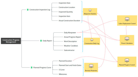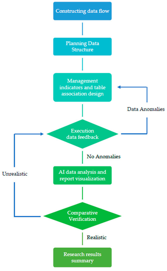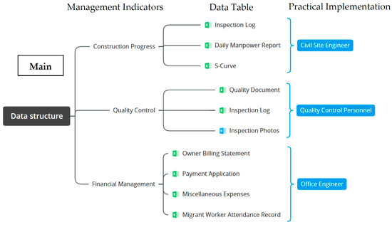 We employed cloud-based spreadsheets. The developed program includes the construction of a data flow process, the design of a data structure for management indicators, and the incorporation of feedback from the execution team (Figure 1). Data is analyzed and compared with that in real-world conditions to evaluate the system’s practicality and effectiveness in site management.