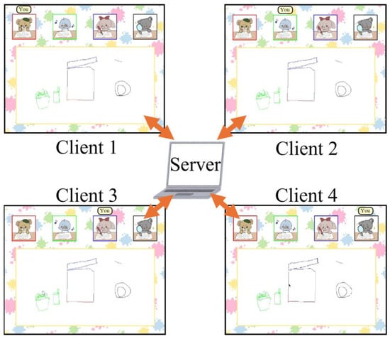 Game system overview. The drawing order of the four players is represented by colors: the first player in red, the second in green, the third in blue, and the fourth in purple.
