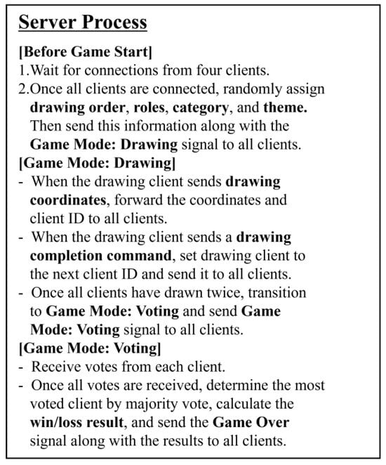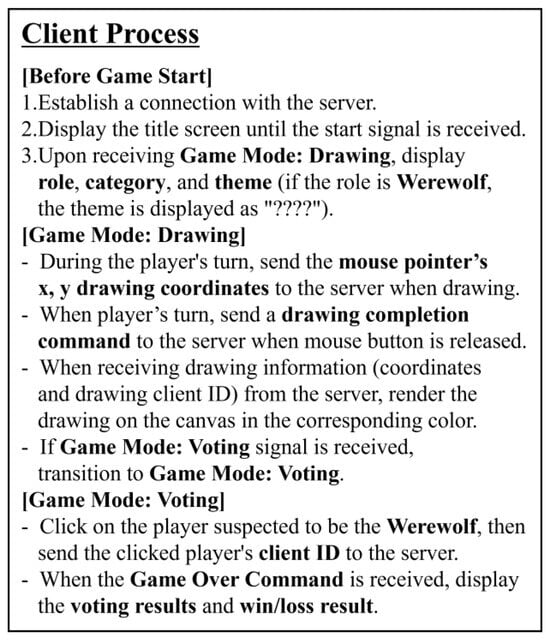 The Drawing Werewolf game consists of two main modes: drawing mode and voting mode. In drawing mode, each player takes turns drawing to gather information for deducing the roles of other players. During a player’s drawing turn, coordinate data is continuously sent to the server, which then forwards the received coordinates to all clients. Each client renders the drawing on the canvas upon receiving coordinate information from the server. After each player has drawn twice, the game transitions to voting mode. In the mode, players cast their votes by clicking on the person they suspect to be the Werewolf. The player(s) with the most votes receive a penalty mark above their icons. If none of the marked players are the Werewolf, the Werewolf wins, while if the Werewolf is among the marked players, the humans win. The current version of the system omits the theme-guessing phase that typically follows.