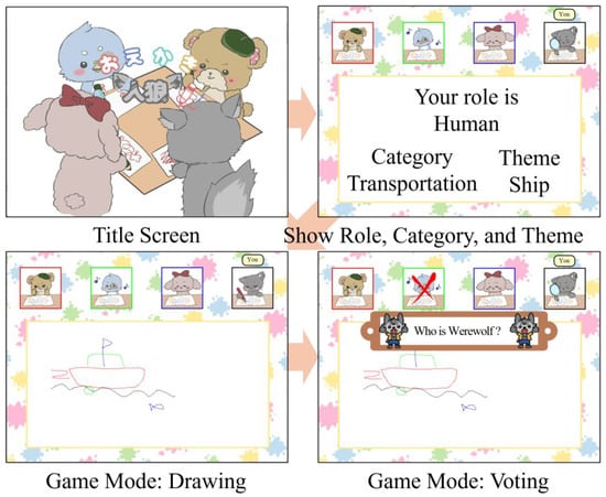 Flow of created Drawing Werewolf game. The color coding of the players’ drawings follows the same convention as in Figure 1: the first player in red, the second in green, the third in blue, and the fourth in purple.