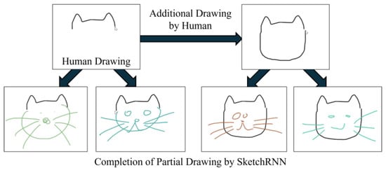 Figure 6 shows how the model completes a sketch of a “cat” that was initially drawn by a human and an example of drawing with SketchRNN. In the figure, the human first sketches the ears of the cat. This partial sketch is processed by the encoder, and the decoder generates a complete drawing shown in the bottom left of the figure. Since the decoder receives a sampled value based on the mean and variance estimated by the encoder, different drawings are generated by sampling different latent values. Next, the human adds the outline of the cat’s head, and the result generated by SketchRNN from this updated sketch is shown in the bottom right. This demonstrates that SketchRNN can generate various drawing sequences based on partial input sketches.