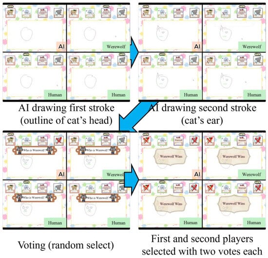 The AI player’s screen is shown in the top-right section of Figure 7, and in this game, Player 2 was the Werewolf. In the game, the role of the AI player was human. We trained SketchRNN using “cat” data from the “Quick, Draw!” dataset and pre-generated a drawing sequence of a cat using random latent variables. In this game scenario, the AI player first drew, and during the first round, it outlined the cat as the first stroke (Figure 7, top left). After the other players took their turns, AI drew again during the second round, adding the cat’s ears as the second stroke (Figure 7, top right). Following the second round of drawing by all players, the game entered voting mode (Figure 7, bottom left). AI randomly selected Player 4. The final votes were two votes for Player 1 and two votes for Player 4. Since both Player 1 and Player 4 were human, and the actual Werewolf was Player 2, the Werewolf won the game.