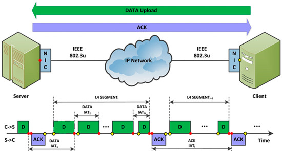 We executed file transfers transmitted by QUIC mechanisms. The same 10 MB file was uploaded from a client machine to the server under different environmental conditions in repeated form (Figure 2). Measurement of the traffic was executed on both sides, server and client network interface cards (NIC). Server time stamps in the time axis are marked with red circles. Yellow circles show sampling times at the client. There are short feedback acknowledgement (ACK) signals transmitted back to the client. Data frames have green color, ACK signals are colored as magenta. On the timeline IEEE 802.3 (Ethernet) frames are represented as rectangles. Green frames move in upward, magenta frames move downward directions. A set of data frames form a network layer (IP) packet, and a group of IP packets create a transport layer (UDP) protocol data unit, called segment.