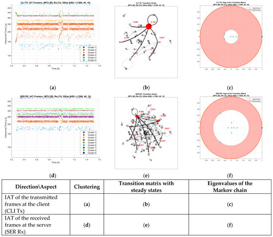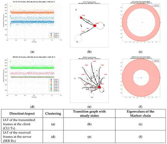 The OPTICS algorithm creates dynamic clusters of the IAT time series on both sides: CLI Tx and SER Rx. The IAT clusters are presented in Figure 3a,d. The width of the clusters depends dynamically on the values. In this measurement, the number of IAT CLI Tx clusters is three, with a relatively large range in the clusters. At the reception side, the same traffic is grouped into eight clusters, some of which have a very thin range. The corresponding Markov transition matrix with the steady states is shown in Figure 3b,e, respectively. At the CLI Tx, two clusters ( and ) are important, and the third one has negligible probability. At the SER Rx state, has a 0.545 steady probability, and the rest of the states converge back to .