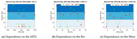 Just one of the MTUs makes a zero spectral gap () at the CLI Tx (Figure 5a). For all of SER Rx, the spectral gap is larger than 0.5 for each MTU. The parameter Bw makes two times zero the spectral gap at the CLI Tx, but at the SER Rx, except for one, all are greater than 0.5. For and , the spectral gap is similar at the transmitter and receiver sides (Figure 5b). A strong similar dependence of the spectral gap at the CLI Tx and SER Rx provides the segment size parameter.