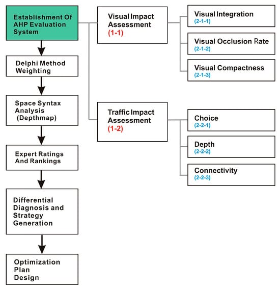 We invited 15 experts to this study, comprising six urban and rural planners, four architectural designers, three space syntax specialists, and two campus managers. All experts possessed more than five years of practical experience in their areas. We conducted three rounds of back-to-back consultations using the Delphi method. During these rounds, the experts scored visual indicators based on their spatial perception experience and traffic indicators based on daily use frequency. We constructed the judgment matrix using Yaahp v12.12 software and processed the data using the geometric mean method. All results passed the consistency test (CR < 0.1). Following the expert consultation, a spatial influence evaluation system was developed using AHP. A seven-point Likert scale was adopted for detailed distinctions and nuanced judgments on complex spatial features, such as visual integration and line-of-sight occlusion. This detailed scoring was crucial for accurately reflecting the spatial situation. The seven-point scale also reduced the likelihood of neutral responses, prompting the experts to judge more rationally. When combined with AHP’s weights, the model accurately reflected the importance of indicators, thereby enhancing the explanatory power (Figure 1).