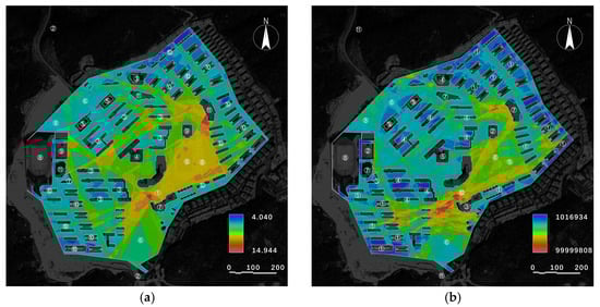 - Visual integration: This metric was used to quantify a viewpoint to connect the global visual network to visual accessibility and penetration efficiency. Areas with high visual integration serve as visual focal points, while low-value areas become spatial blind spots. Visual integration was used to identify the components of the campus, such as enclosed squares or obscured building entrances, that lack visual appeal, as shown in Figure 2a.