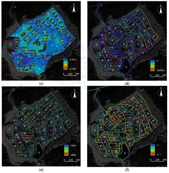- Connectivity: This refers to the number of components directly connected to a given component, reflecting the degree of spatial networking and permeability. Based on topological adjacency statistics, a high connectivity value indicates that the component is a transportation hub. Connectivity was used to evaluate the permeability between different functional areas on campus, as shown in Figure 2f.