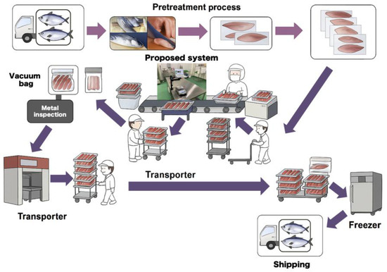 Before freezing fish, they are cut into standardized forms such as filets or sashimi slices. These slices conform to specific size and weight criteria to meet market expectations and ensure even freezing. However, in most processing factories, skilled workers are performing this task. Despite their experience, the manual nature of the task inevitably introduces variability in the product dimensions, leading to inconsistent sizes of sashimi pieces. Such inconsistency worsens the quality and raises the risk of defective or out-of-spec products. The absence of a standardized sizing process affects the production efficiency, introduces delays in packaging and labeling, and undermines the overall reliability of the supply chain.