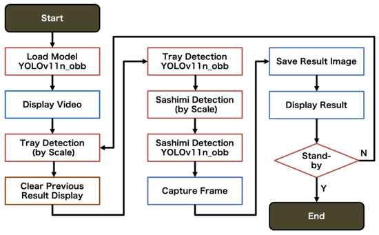 After inspection, the trays of approved sashimi slices continue through the standard production flow. The sashimi pieces are vacuum-sealed and inspected for metals to ensure product safety. Approved products are transported to the freezing unit, where they are rapidly frozen to maintain freshness and hygiene. The frozen sashimi pieces are packed for shipment, ensuring high-quality delivery to customers. In the factory, trays are transported between workstations. The transportation process allows for production tracking and process monitoring. Figure 2 shows a diagram of the developed system. The system first loads a pre-trained YOLOv11n-obb model to perform object detection with oriented bounding boxes. This enables accurate recognition of sashimi pieces, even when they are placed at various angles on the tray.