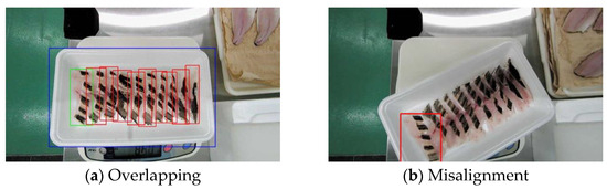 Experiments were conducted using the YOLOv8n model on a dataset comprising 328 high-resolution images (1920 × 1080 pixels). A total of 263 images were used for training, while 65 were reserved for validation. Although YOLOv8n offers fast inference speeds for real-time implementation, several limitations were observed in the detection accuracy. Two major issues affected the performance. First, overlapping sashimi pieces often led to detection failures. When all the sashimi pieces were placed on the tray before image capture, several pieces overlapped, making it difficult for the model to distinguish individual objects (Figure 3a). Second, misalignment problems occurred when trays or sashimi slices were tilted during placement (Figure 3a). Since YOLOv8n relies on axis-aligned bounding boxes, its ability to accurately detect rotated objects and calculate their dimensions was limited. These factors highlighted the need for the development of a more robust, orientation-aware model.