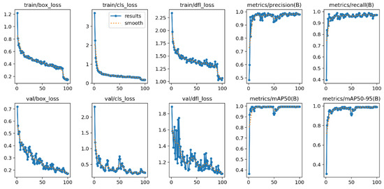 The performance of the sashimi size detection model using YOLOv11n-obb was evaluated for 100 epochs. Figure 5 presents key metrics, including loss curves and evaluation scores (precision, recall, and mean average precision (mAP)), providing information on the convergence and detection ability of the model.