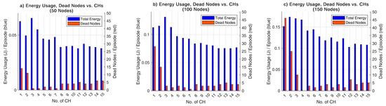 As mentioned before, in LEACH models, generally, 5% of the active nodes were selected as CHs. However, this is not always the optimal number (Figure 2). The optimal number changed with the number of active nodes, energy levels, and distances between them. As a node’s transmission energy was summed up if the transmission was made, we did not observe the energy increasing past the optimal number of CHs but an increase in the number of dead nodes.