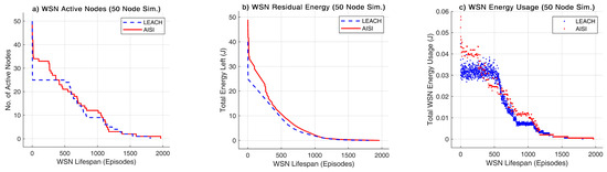 Figure 3c presents the energy usage of the sensor nodes in each step. The AISI model had a larger initial energy usage due to more active nodes in the network. At around iteration 500, the number of active nodes with both methods equaled, and the AISI model used less energy due to the SI optimization. Therefore, the energy usage with the AISI model was higher due to the higher active node count. With 100 nodes, LEACH WSN’s lifespan was 2503 episodes, while with AISI, it was 2780, which is an increase of 11.07% (Figure 4).