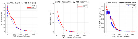 In the simulation with 150 nodes, the lifespan of the WSN with LEACH was 3566 episodes, while with AISI, it was 4348, which is an increase of 21.93%. Figure 5 compares the active number, residual energy, and energy usage (Figure 5).