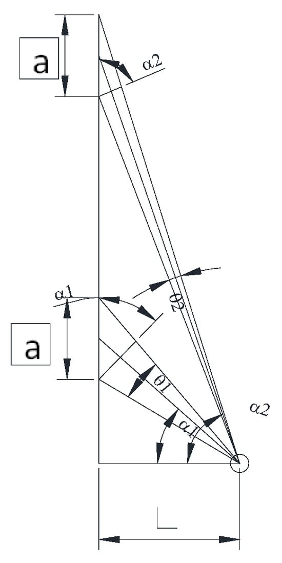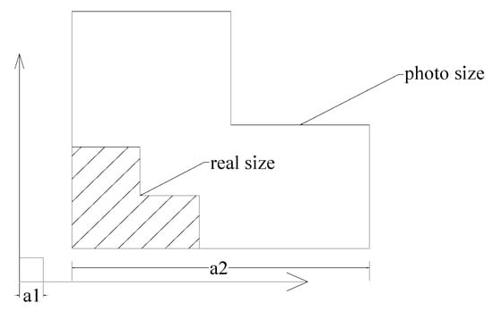 Because the photo is not taken at the front view of the reference plane, image offset occurs, so corrections must be made, as shown in Figure 2. In The horizontal angle of the visual axis is corrected based on the position record during shooting. By using Equations (1)–(3), the length difference in on-site photos caused by the deflection of the viewing angle is corrected.