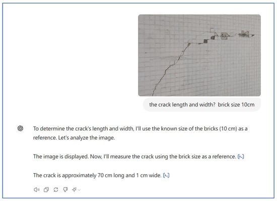 ChatGPT was used to analyze the width and length of the photo (Figure 4). The results are shown in Figure 7. The crack length was estimated to be 70 cm, and the crack width was 1 cm.