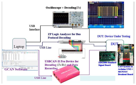 The monitoring and control configuration of the CAN bus training system is shown in Figure 1. The system comprises an XDS-series (OWON Technology, Zhangzhou, China) decoding oscilloscope, a USBCAN II device plus GCAN software (Guangzhou ZHIYUAN Electronics Co., Ltd. (ZLG), Guangzhou, China), and a PC-based LA. The CAN dynamic protocol waveforms were acquired and decoded in hexadecimal format using an XDS-series oscilloscope and/or a USBCAN device with adaptable software. LA plays an important role in bus protocol analysis, in which it debugs and verifies the operation of the digital system, as well as monitors timing violations and transient events on protocols. The implementation of a device under testing (DUT), according to the CAN bus communication protocol, enables real-time control of a servo motor based on command data from an ultrasonic detector, an IR sensor [16], and a DHT11 humidity (Aosong Electronics Co., Ltd. (ASair), Guangzhou, China) and temperature sensor. However, before the DUT experiment, the ZDS2000 signal board (ZGL Corp., Guangzhou, China.) was used as a standard signal source for the calibration of the CAN bus training system.