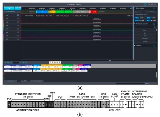 (a) CAN system protocol from PC-based logic analyzer and (b) Standard message frame of the CAN protocol [5].