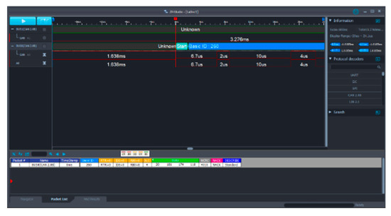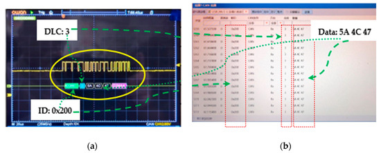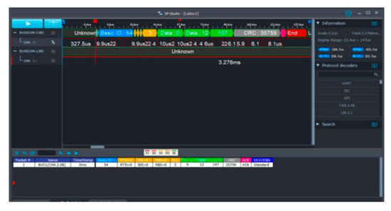 The CAN 2.0 system was built following the communication regulation and ISO11898-1/16845/CiA601 protocol. Due to all testing items for real-time control being normal UDTs without limitation, the design cost is reduced with the excellent network feature. Furthermore, correlation between multiple digital signals simultaneously is found, so the system procedure violation is detected in massive protocol data by using the CAN protocol acquired by LA (Figure 2a). CAN, a broadcast system, has a mechanism of error detection to avoid faults during signal transmission on bus lines. There are five error-proofing mechanisms with cyclic redundancy check (CRC), frame check, ACK errors, monitoring, and bit stuffing on CAN 2.0 data frame (Figure 2b) [5]. While one or more errors occur, these delivered messages are interrupted as a fault frame. Furthermore, any node resends a message using a CAN frame arbitration on a bus or into an idle mode. During idle mode, it has at least 11 successively received bit times (“1” or –0 volts CAN_High to CAN_Low). Other multiple μ-controllers as nodes tend to start their message frames. A “data frame” is considered the same as a CAN frame: using more than one frame to send a long message in the arbitration mechanism. In this case, a multi-packet protocol is applied via a USBCAN-II device, and displays the protocol format after using GCAN analysis software (PLC-400/510/511, Guangzhou ZHIYUAN Electronics Co., Ltd. (ZLG), Guangzhou, China), as shown in Figure 1. The CAN 2.0 system is widely applied to vehicle electronic components due to its high reliability.