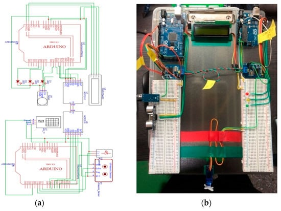 UDT circuit layout and prototype design of CAN system: (a) Layout drawing of electronic circuits; (b) Photo taken of the practical project.