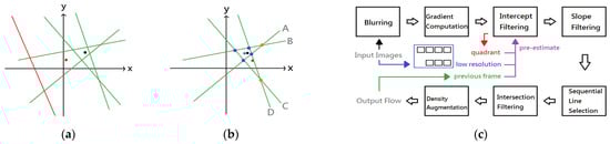 When enough qualified lines remain, we use a lightweight method to select the best ones and compute their intersections. The geometric center of these intersections approximates the true optical flow. When intersections stray from the estimated flow (Figure 1b), a filter is applied to remove them before the final calculations. The SIF algorithm performs this efficiently in eight non-iterative steps (Figure 1c).