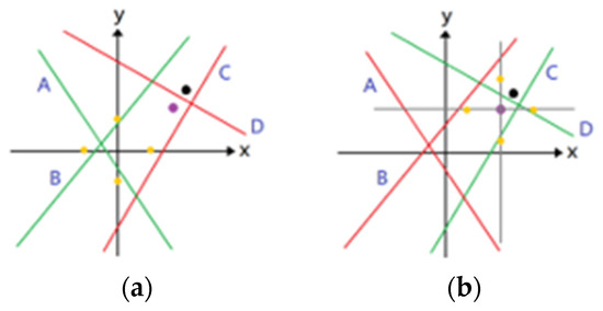 The concept of intercept filtering. For simplicity, only four lines are shown. The black and purple dots represent the true and pre-estimated optical flow, respectively. The yellow dots represent CF. (a) When using the origin as the reference point, lines A and B are qualified, while lines C and D are unqualified. (b) When shifting the origin to the pre-estimate, lines C and D are qualified, while lines A and B are unqualified, resulting in a more accurate optical flow estimation.