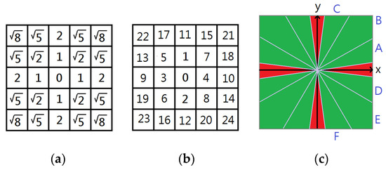 Sequential line selection. (a) Distance of each pixel from the center pixel. (b) The pixels are ordered based on their distances from the center pixel. (c) The slope filtering stage removes the slopes that fall in red areas. The green area with a positive slope is divided into three sections: A, B, and C. The green area with a negative slope is divided into three sections: D, E, and F.