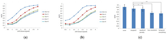 Experimental results of five different blurring window sizes over eight translation distances. (a) Results for simpleLK, (b) results for SIF, and (c) the performance of different ways of optical flow pre-estimation. We performed the statistical test using the paired t-test (*: p < 0.05, **: p < 0.01).