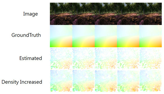 We visualized the optical flow direction and magnitude using colors and compared the original images from the MidAir Dataset, the ground truth, and the results of the SIF algorithm both before and after density enhancement (Figure 5).