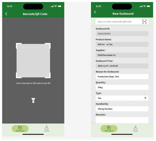 The mobile prototype design is tailored to meet the operational requirements of factory personnel, featuring core functionalities including barcode-based inbound and outbound inventory processing and inventory queries. The design enables operational convenience and efficiency. The navigation bar at the bottom of the home interface consists of two main sections: Workbench and My Profile. The Workbench section facilitates inventory management functions, including check-in and check-out operations, while the My Profile section enables users to configure account settings. The streamlined navigation and functional layout enhance user experience by allowing users to quickly familiarize themselves with the system (Figure 4 and Figure 5). Based on user requirements, the mobile interface design incorporates quick response (code) or barcode scanning functions. The system automatically populates relevant information based on scanned barcodes, thereby minimizing errors in manual data entry and enhancing inventory operation efficiency. To maintain data integrity, users must document the reason for material dispatch during outbound processes, preventing data inconsistencies resulting from special circumstances such as testing procedures or material shrinkage (Figure 6).