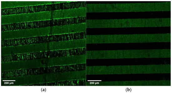 The next phase of the study involved binding the antibodies to the substrate. A biotinylation kit, Biotin Conjugation Kit (Fast, Type B) (sourced from Abcam, Cambridge, UK), was used in conjunction with monoclonal antibodies sourced from Cloud-Clone Corp., Wuhan, China (host species mouse). The kit yielded antibodies with a biotin tag on the Fc portion of the antibodies. From the stock solution, biotinylated antibodies, at a concentration of 20.833 µg/mL of PBS, were made. These antibodies were allowed to incubate onto functionalized transducers (and a non-functionalized control transducer) for 6 h in a dark room. After incubation, the sensors were rinsed five times with PBS to remove any unbound antibodies. Afterwards, 50 µL of 40 µg/mL of secondary anti-mouse antibody with an Alexa Fluor 488 tag was placed in the wells. This antibody was allowed to incubate for 5 h in a dark room. After incubation, the wells were again rinsed five times with PBS, after which the sensors underwent confocal fluorescence microscopy using a Zeiss LSM780 (Zeiss: Oberkochen, Germany), the results of which show that the primary antibodies successfully bound to the functionalized transducers (see Figure 1a). Note that the control sample would have no antibodies bound to the nanofibers as the nanofibers were not functionalized with streptavidin, meaning that no biotinylated antibodies would bind to them. The absence of primary antibodies meant that no secondary antibodies would bind, resulting in no fluorescent markers on the control. Figure 1b shows clean black bands where no fluorescence is observed. These are the gold fingers of the IDEs. The lack of fluorescence confirms that the nanofibers do not auto-fluoresce, unlike the FR4 substrate.