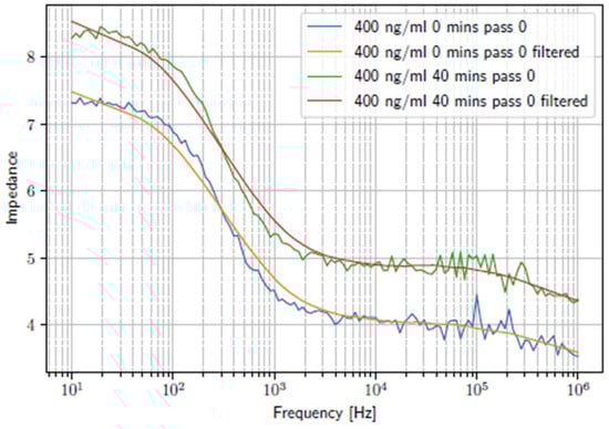 The EIS spectra were obtained for the range 10 Hz to 10 MHz, after which a Savitzky–Golay filter was applied to the data to compensate for noise in the system. Figure 2 shows the bode plot of one measurement taken before and one measurement taken after antigen addition (at 400 ng/mL). The raw data is overlaid with the filtered data. The filter had a window length of 31 and a polynomial order of 1.