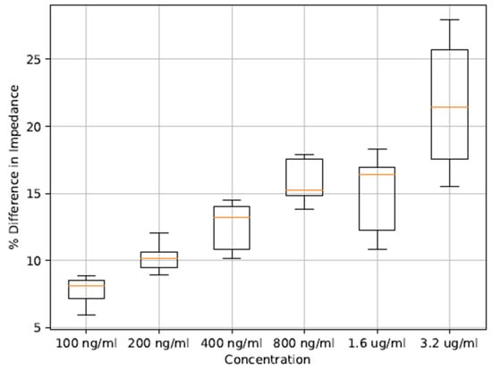 Box-and-whisker diagram of the percentage difference in the impedance modulus observed at different concentrations of CRP in PBS.