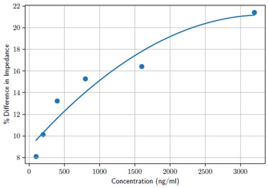 This figure shows a trend of an increasing change in the impedance modulus, corresponding to an increase in antigen concentration. The data show a tight distribution at lower concentrations. Plotting the medians of the data sets, to gain insight into the trend of the data while accounting for outliers, on a linear plot shows a parabolic trend (see Figure 4).