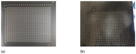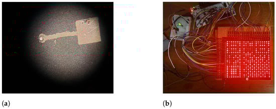 Figure 1a shows the top layer of the designed 14 × 12 cm, 21 × 21-pixel LED driver circuit that was successfully printed onto a sheet of Kapton, using the Dimatix inkjet printer in conjunction with silver nanoparticle ink, and subjected to the sintering process. The sintering process was deemed successful after testing the conductivity of the respective tracks using a multimeter.